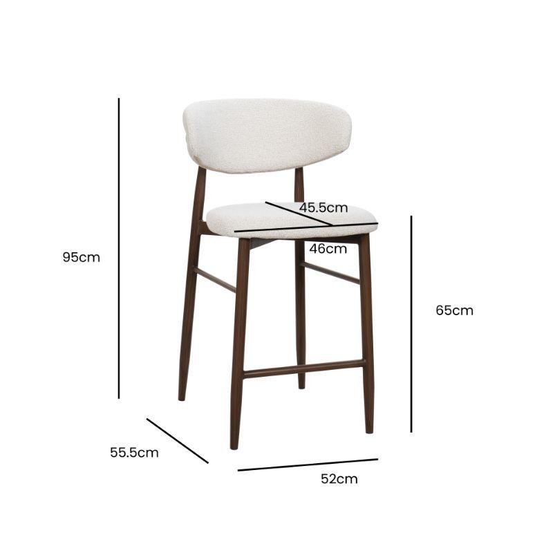 כיסא בר בעיצוב מודרני ונקי, המתאים לאי במטבח, דלפק או פינת בר ביתית. הכיסא כולל מושב ומשענת מרופדים בבד אריג בגוון לבן בהיר וטבעי, עם ישיבה נוחה ותומכת לשימוש יומיומי. רגלי העץ בגוון אגוז מעניקות יציבות ומראה חמים שמשתלב היטב במטבחים ובחללים שונים בבית, ומתאים גם לשימוש בחללי אירוח ומסעדות.